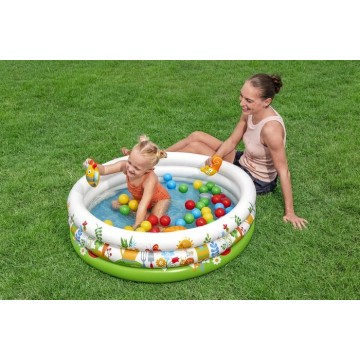 Детски надуваем басейн в комплект с различни топки за игра, подходящ както за пълнене с вода, така и за игра в него без вода.