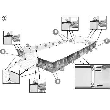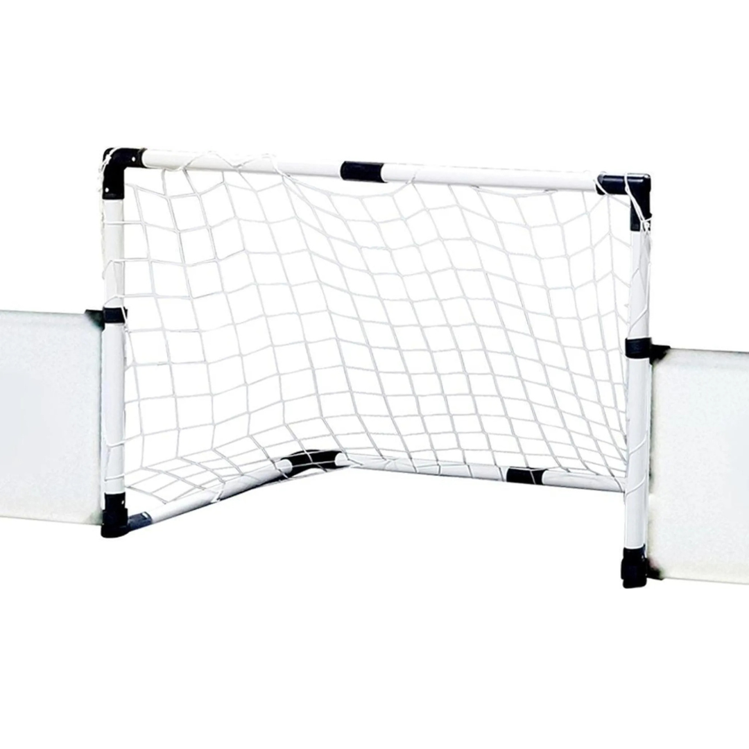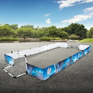 - Съдържа всичко необходимо за футболна игра - ограда с принт за игрално поле, две врати с мрежа, помпа и топка;