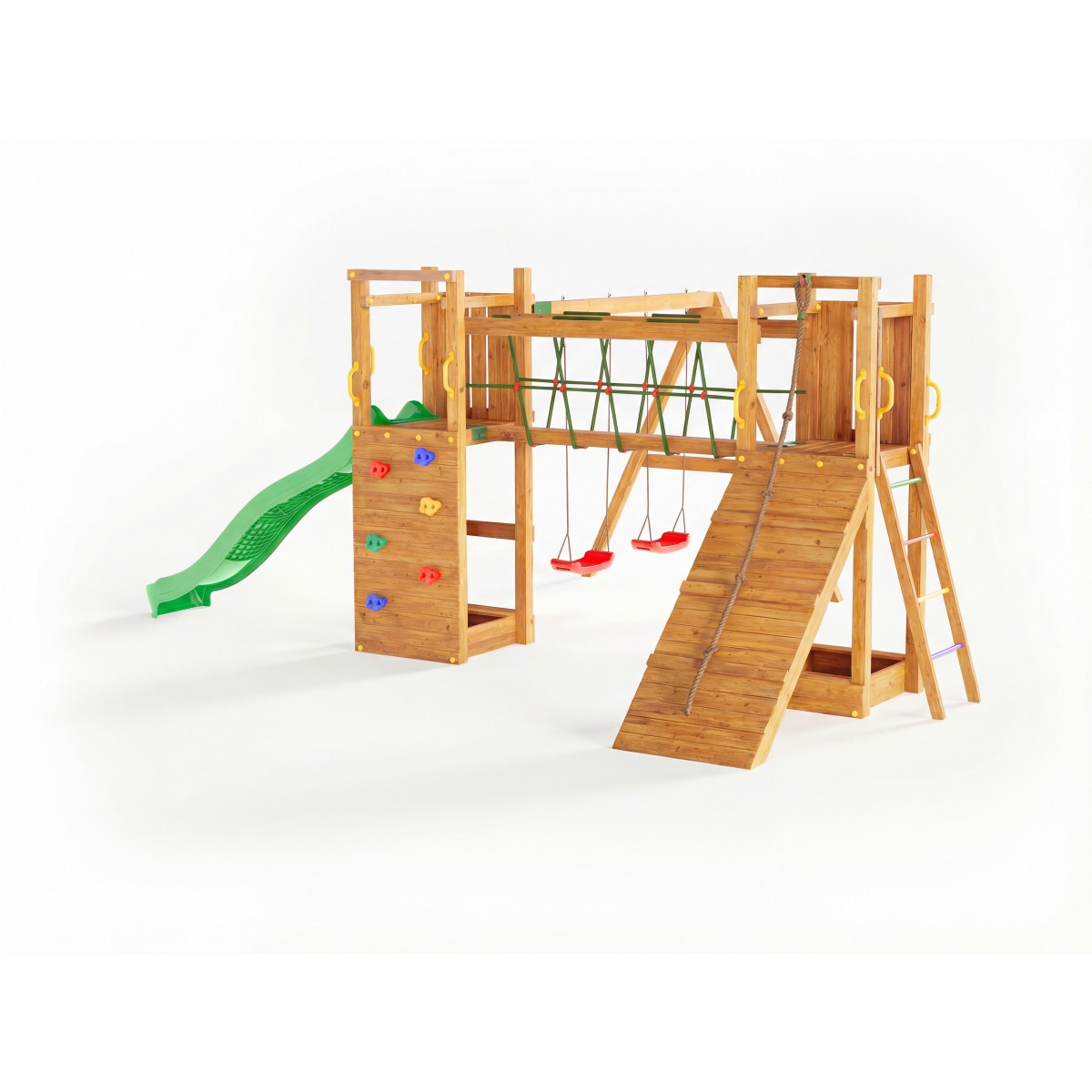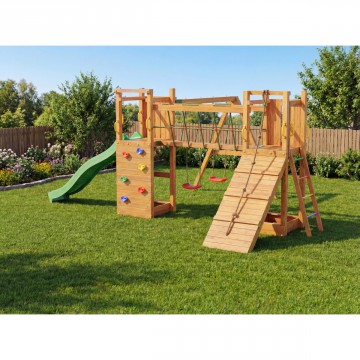 Дървения материал се обработва машинно, и се цикли, като повърхността е идеално гладка, без остри ръбове, което премахва възможността за наранявания при контакт с чувствителна кожа. Дървото е импрегнирано с цветен импрегнант, който не само осигурява дълготрайност, но също така и идентичен цвят на всички елементи. Съдържа инструкции стъпка по стъпка както и аксесоари и крепежни елементи за сглобяване. Максимално натоварване: максимум 9 деца едновременно.