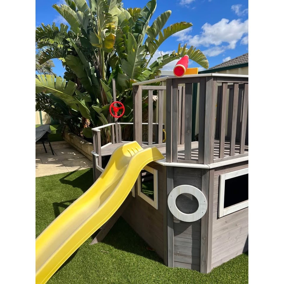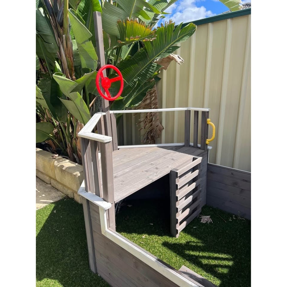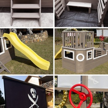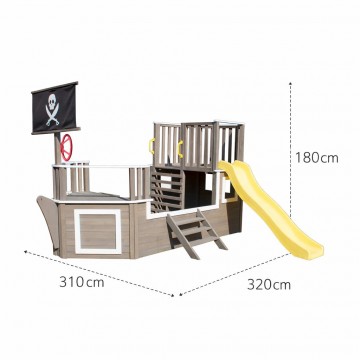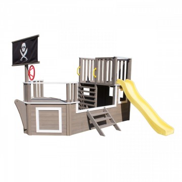 Детска дървена площадка във формата на пиратски кораб, който насърчава въображението и ролевите игри. Подходяща е, както за двора, така и за детски центрове и градини. Комибира различни съоражения за активност и игра.