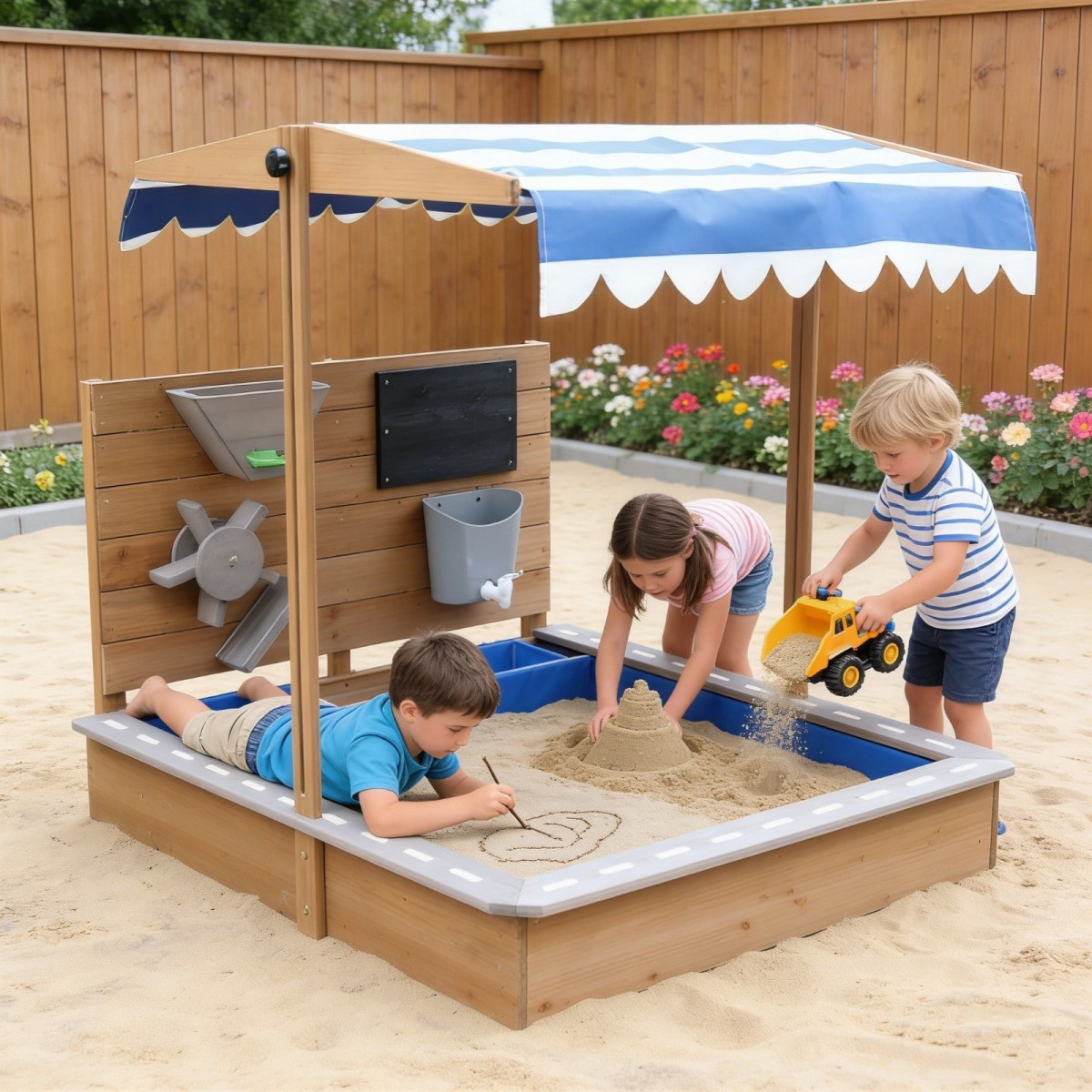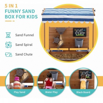 Детски дървен пясъчник с регулируем покрив и различни аксесоари, създаден за да осигури място за часове на игра в двора за малките. Подходящо, както за дома, така и за детски центрове и градини.