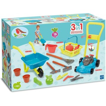 - Включени имитационни - количка, косачка, клещи, лопата, гребло, зеленчуци, саксии, кошница, лейка и други;
