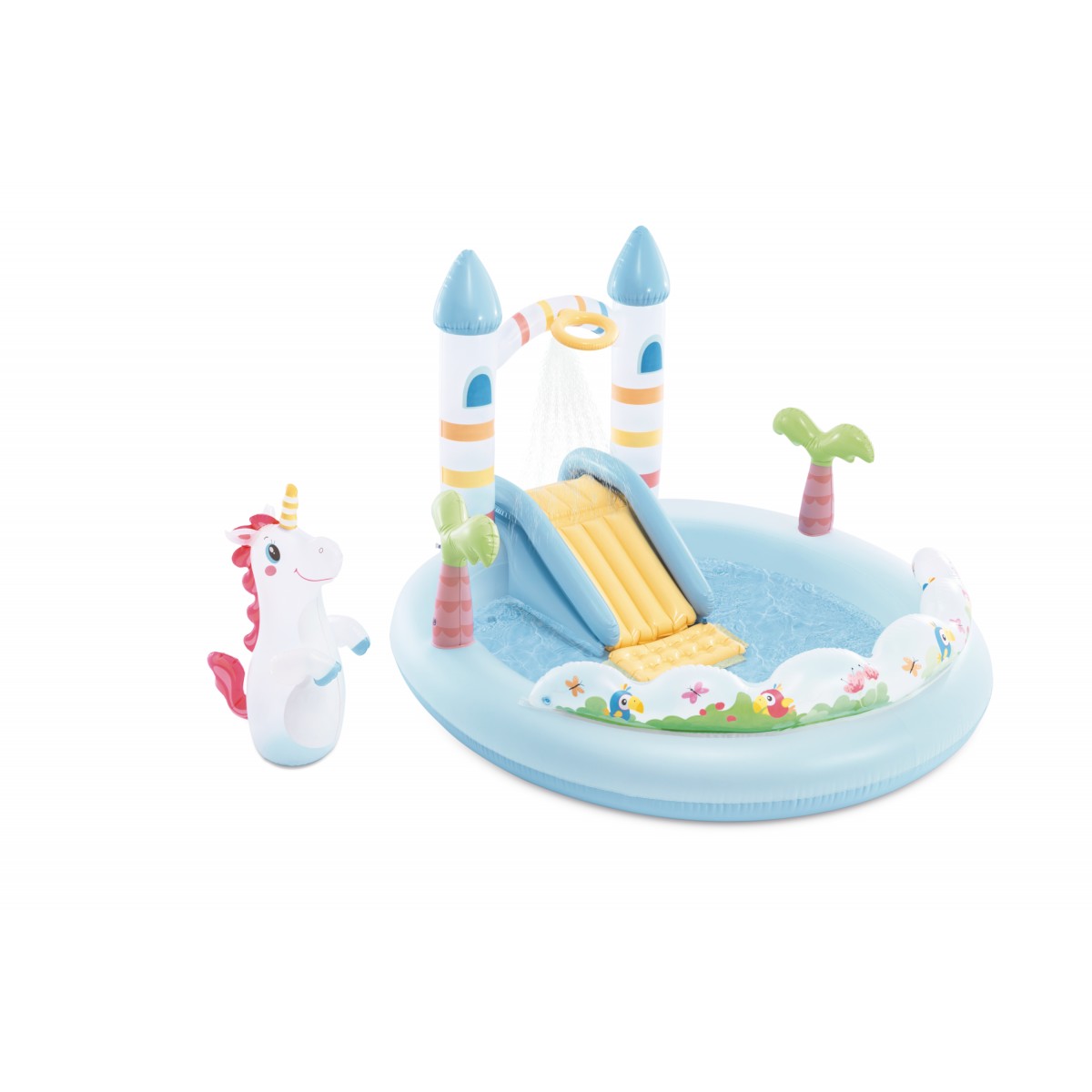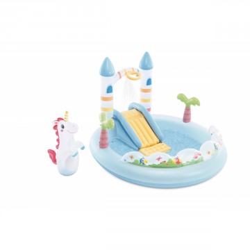 Надуваем воден център за игра с фигура еднорог, пързалка и басейн, подходящ за всеки двор.