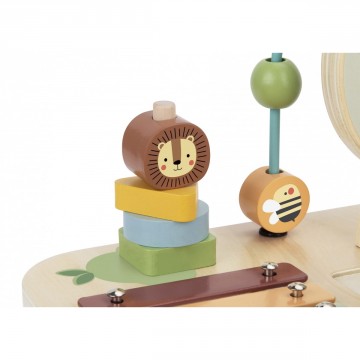 Дървена активна маса с различни активности, подходящи за забавление и учене на нови умения.