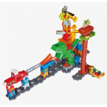 Детска писта с мраморни топчета и динозавър в центъра ѝ, който захапва големите топчета.